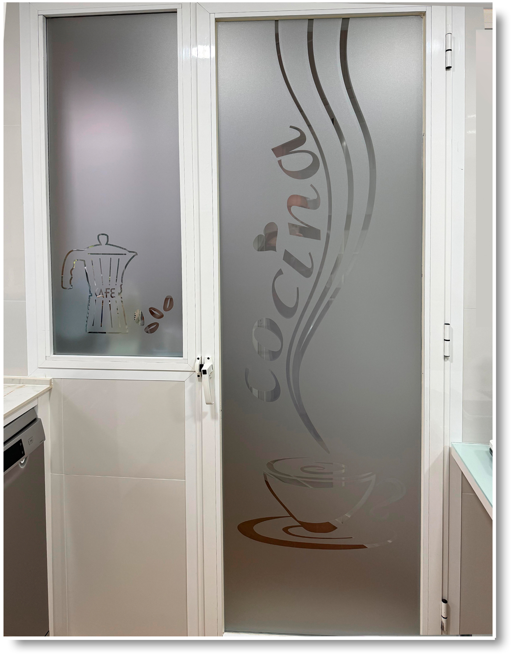 Vinil per vidreS efecte esmerilat, amb una tassa de cafè fumejant amb la paraula CUINA retallada. Model simple, elegant i modern. Selecciona l’idioma en que el vols.