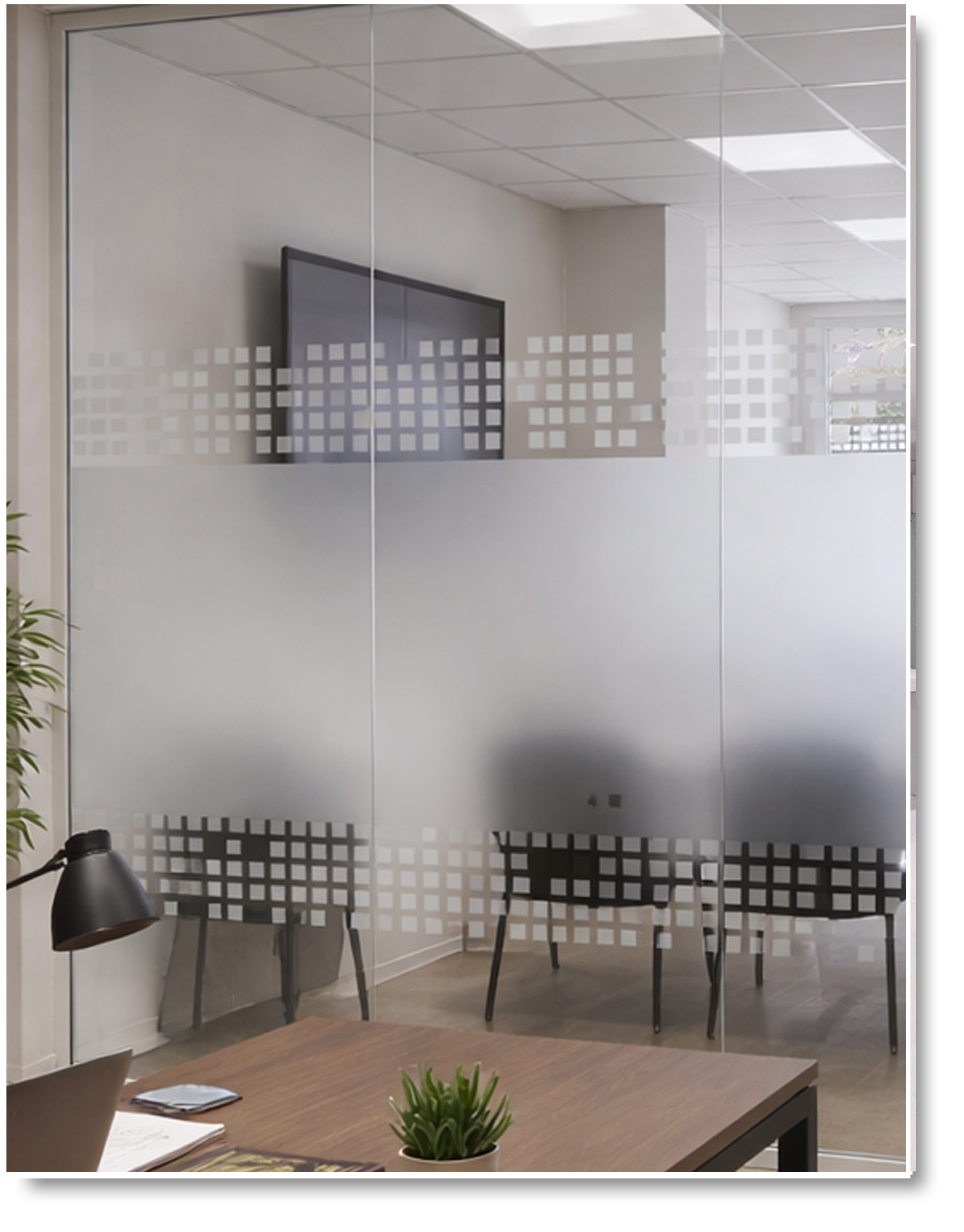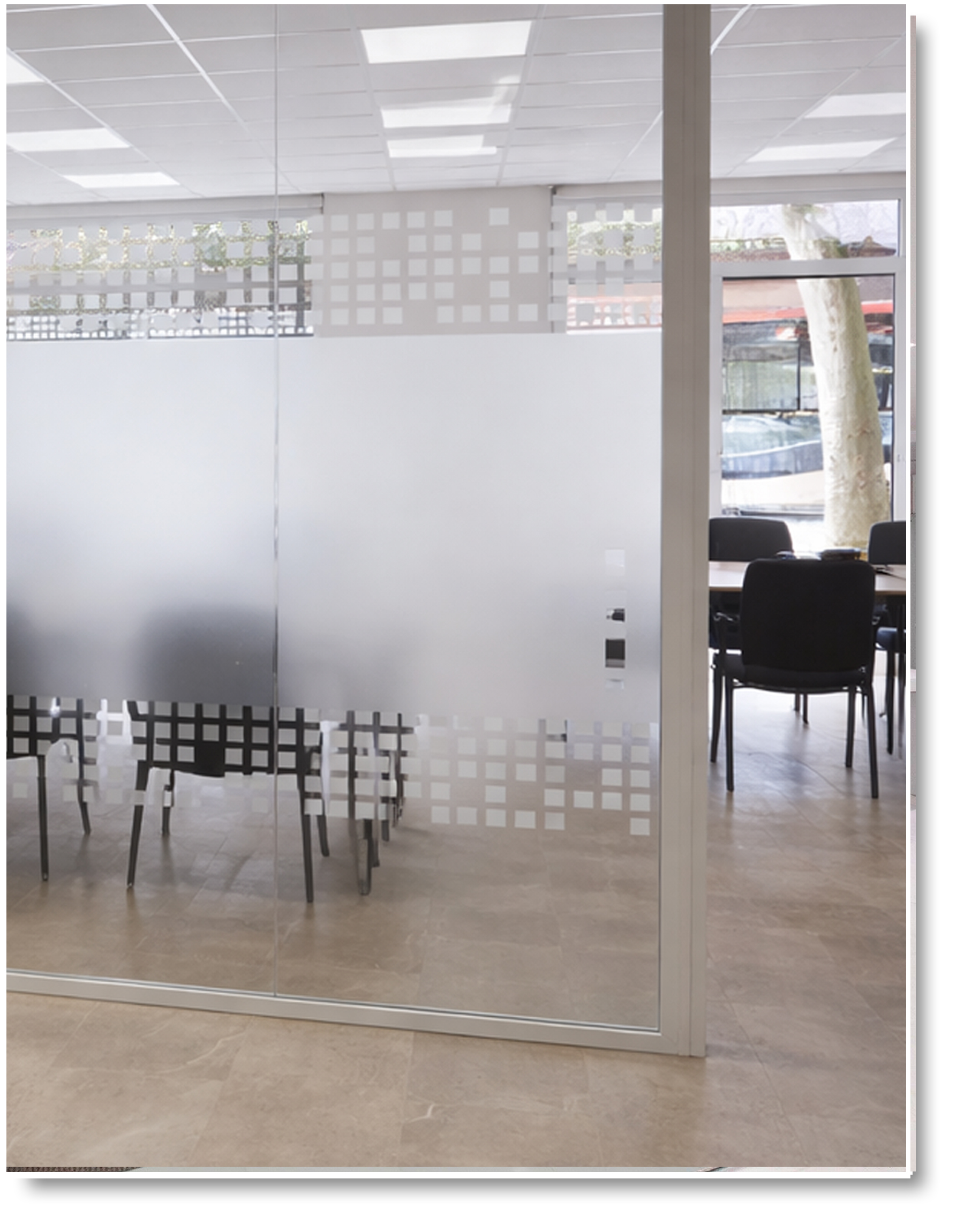 Los vinilos decorativos para cristales oficina son realizados con vinilo adhesivo translúcido o esmerilado especial para cristales que DEJA PASAR LA LUZ y DA PRIVACIDAD.